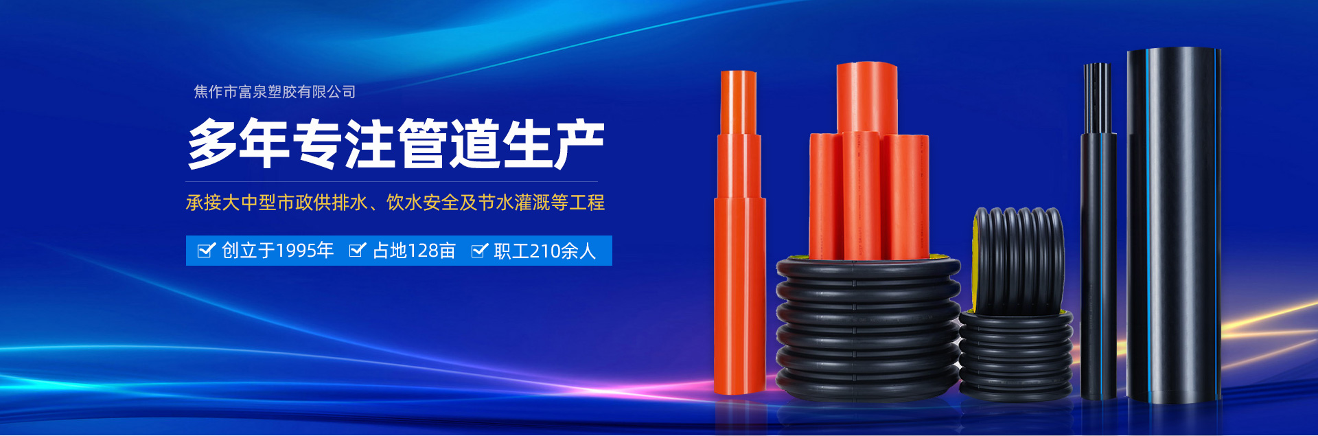 - 焦作市富泉塑胶有限公司,创立于1995年,是一家集研发、设计、生产、销售为一体的大型管材企业。公司位于太极故里、黄河之滨一一河南焦作温县。公司占地128亩,现有职工210余人,其中具有中技术职称的19人。生产、检验设备58台(套),包括PVC实壁管生产线11套、PE实壁管生产线12套、HDPE双壁波纹管生产线6套、PVC双壁波纹管生产线5套,检验设备14台(套)。主要产品有:Φ20mm-630mm、各种压力规格的PVCU、PVC-M、PE给水管材,PVC-U节水灌溉管材,HDPE燃气和矿用管材,DN200-800mm的HDPE、PVC双壁波纹管及各种喷灌、滴灌工程材料。承接大中型市政供排水、饮水安全及节水灌溉等工程。 富泉塑胶公司重视产品的质量、安全、环保和节能,在同行业中率先完成了“新华节水产品认证”,全方面通过ISO9001:2008国际质量管理体系、IS014001:2004环境管理体系和OHSAS18001职业健康安全管理体系的一体化导入,并建立起规范的现代企业管理体系。公司以“质量”为先导,采用质量跟踪、多环节把关的方法,组建具有行业水准的企业技术检测中心,常年委托水利部节水灌溉设备检测中心、河南省产品质量监督检验院对产品跟踪检测,并由中国人民保险公司承保产品质量。公司连续多年被河南省水利厅确定为“安全饮水设备、节水灌溉设备”定点生产企业,并获得“中国名优产品”“质量、服务、信誉AAA企业”“河南省**产品”“河南省水利企业”“河南省守合同、重信用企业”等荣誉称号。 富泉塑胶公司坚持“用户为上”的服务理念,长期以来,全方面关注客户价值,不断提升服务水平。服务队伍常年为客户的产品设计、施工、安装提供合理的方案和全程细致、周到、**、快捷的技术服务。公司自成立以来,一直坚持以人为本的宗旨,塑造企业形象,并致力于新产品的开发,凭借雄厚的技术开发能力,先进的工艺制造流程,严格的质量管理保证体系,优良的售后服务网络,已成为河南省大的饮水、灌溉及排水管材设备制造商。产品畅销全国,而且还以公司雄厚的综合实力在业界中占据着重要的地位。
